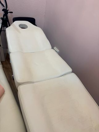 Camilla de masaje blanca, ideal para tratamientos de belleza o masajes. Su diseño permite ajustar la altura y la inclinación. - Tapicería de vinilo. - Reposacabezas extraible con orificio. - Estructura metálica. Y de regalo aparador blanco usado