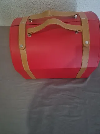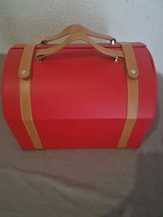 Maleta con un diseño único en forma de barril, ideal para transportar tus pertenencias con estilo. - Color rojo vibrante. - Acabados en cuero sintético color coñac. - Asas y detalles reforzados.