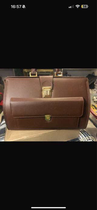 Preciosa maleta de médico antigua, ideal para decoración o uso. Es de cuero marrón, con un diseño clásico y elegante. - Asa de mano resistente. - Cierre metálico dorado. - Compartimento interior con forro beige. - Bolsillo frontal con cierre.