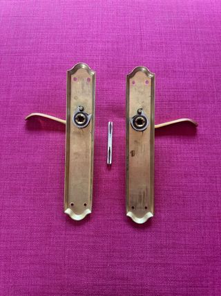 Pareja de manillas doradas para puerta. Se encuentran en buen estado, con ligeras marcas de uso. - Material: Metal dorado. - Diseño elegante y clásico. - Incluye dos manillas y sus placas de montaje.