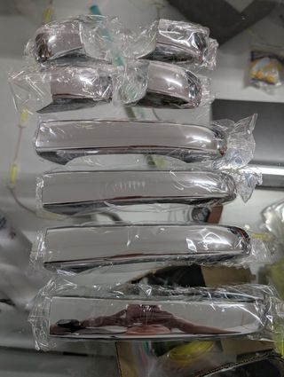 Juego de manillas cromadas para coche. Son 8 piezas en total, incluyendo las manillas de las puertas y las tapas. Están nuevas, sin usar, y en sus embalajes originales. Se ven brillantes y relucientes. - 4 manillas cromadas para puertas. - 4 tapas cromadas. En la fotos modelo
