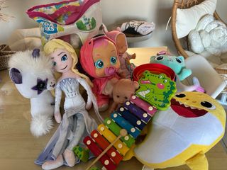 Lote variado de juguetes infantiles. - Muñeca Elsa de Frozen. - Muñeca Cry Babies. - Peluche de unicornio blanco. - Peluche de tiburón Baby Shark. - Peluche de gato azul. - Xilófono de madera con diseño de cocodrilo. - Bolsa de juguetes. - Muñeca bebé.