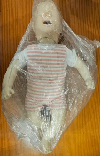 Maniquí de lactante, ideal para prácticas. - Entrenamiento de RCP Básicas. - Ropa a rayas rosas y blancas. - Material de vinilo. Dispongo de dos unidades. Precio de cada uno.
