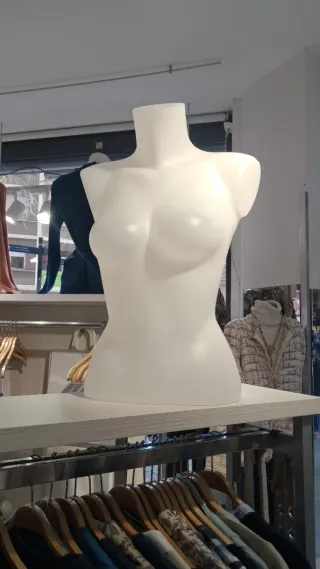 Maniquí de torso femenino en color blanco. - Ideal para escaparates o expositores. - Diseño elegante y minimalista.