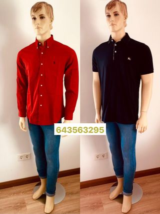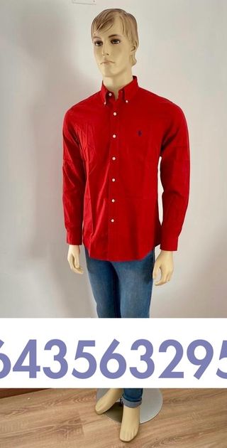 Camisa de manga larga en color rojo, con el logo de la marca bordado en el pecho. - Cuello tipo button-down. - Cierre de botones. - Puños abotonados.Maniquí hombre de cuerpo entero con brazos, piernas y sobre una base metálica. De color carne, con los ojos azules, cejas y pestañas. En buenas condiciones. Altura 1,90m.