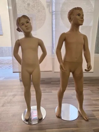 Pack de dos maniquíes infantiles, perfectos para escaparates o exposiciones. Tienen algún deterioro por el uso... Se ve en la fotos - Maniquí de niño. - Maniquí de niña. - Base metálica incluida.