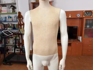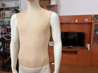 Maniquí de torso masculino, ideal para exhibir ropa o para costura. - Forma de torso. - Acabado en tela beige.