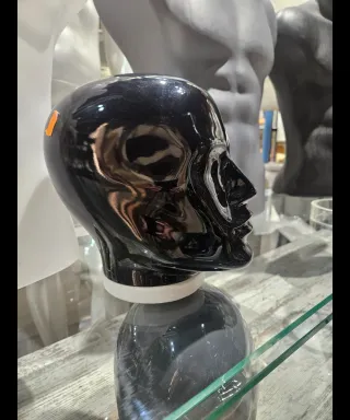 Cabeza de maniquí de estilo masculino, con un acabado negro brillante. Nueva a estrenar. - Diseño liso y moderno. - Base de soporte incluida.
