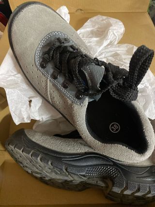 Zapato de seguridad en color gris. - Talla 38. - Cierre con cordones negros. - Suela de goma negra.