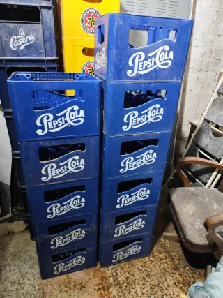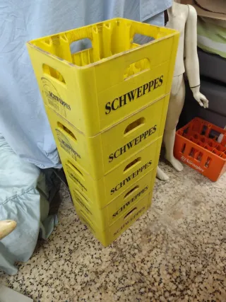 Conjunto de cajas de plástico para transportar bebidas. Son resistentes y prácticas.ideal decoración.poligono industrial del Aeropuerto de Manises VALENCIA.el precio por unidad comprando todas es de 10.€ cada una.comprando sueltas a 15.€.unidad.no se hacen envíos unitarios.se puede hablar para hacer transporte de todas para VALENCIA y alrededores.excepto centro histórico. - Material: Plástico - Color: Azul.amarillo.naranja.verde. - Diseño: Con asas laterales y espacio para botellas