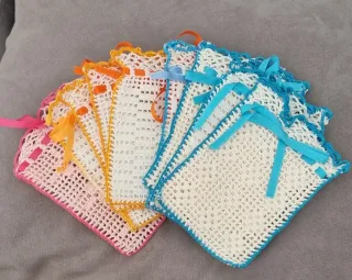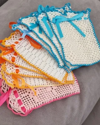 Conjunto de bolsitas hechas a mano con ganchillo, cada una adornada con una cinta de color y medidas de 14cm x 9'5cm Sirve principalmente para: Bolsa perfumada: se mete dentro lavanda, pétalos secos o bolitas aromáticas y se pone en cajones o armarios. Guardar un jabón pequeño (muy típico en regalos). Guardar cosas pequeñas: joyitas, rosarios, recuerdos, etc. El lacito azul es solo decorativo y para cerrarla un poco.