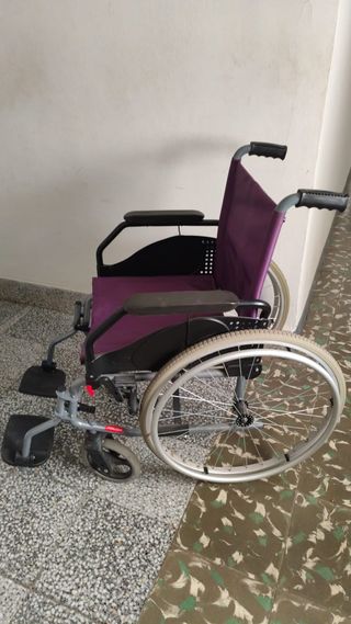 Silla de ruedas plegable en color morado. Fácil de transportar y almacenar. - Asiento y respaldo de tela. - Ruedas traseras grandes y ruedas delanteras pequeñas. - Reposapiés ajustables.