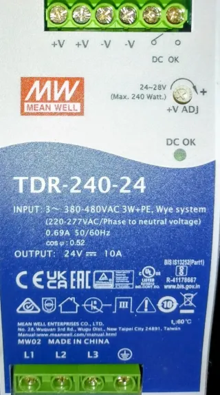 Fuente de alimentación trifásica MEAN WELL modelo TDR-240-24. - Entrada: 3~ 380-480VAC 3W+PE, Wye system (220-277VAC/Phase to neutral voltage). - Corriente de entrada: 0.69A 50/60Hz. - Factor de potencia (cos φ): 0.52. - Salida: 24V DC, 10A. - Rango de ajuste de voltaje de salida: 24~28V. - Potencia máxima: 240 Watt. - Indicador DC OK.