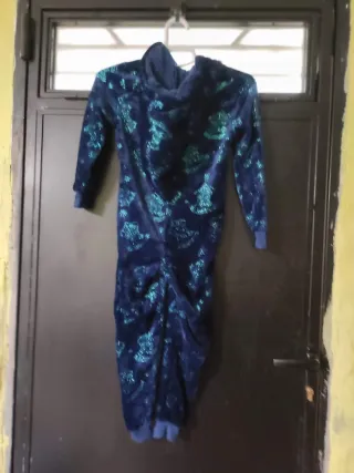 Pijama de una pieza para niña, ideal para estar cómoda en casa. - Parte superior azul con capucha y estampado. - Parte inferior rosa con brillo y estampado. - Puños y tobillos en azul.