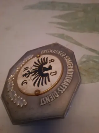 Insignia del ADAC Freiwilliger Kameradschafts Dienst. - Diseño octogonal. - Águila imperial en el centro. - Corona de hojas de roble. - Inscripción Freiwilliger Kameradschafts Dienst en el borde.