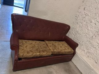 Sofá de dos plazas con tapicería de tela y estructura de piel sintética. - Color marrón. - Diseño clásico. - Cojines con estampado floral.
