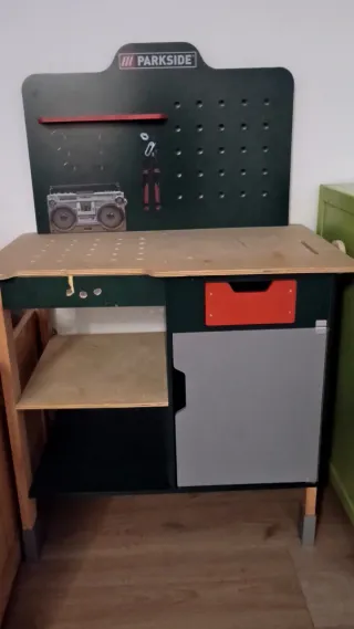Se regala conjunto de mesa de taller y mueble para niños. - Mesa de taller con panel perforado. - Mueble con cajón rojo y puerta gris. - Estanterías inferiores. Se regala venir a buscar a un tercer piso