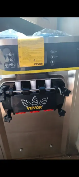 Máquina de helados Vevor con dispensador frontal. - Diseño moderno en acero inoxidable. - Panel de control con botones de función. - Incluye tres boquillas para helado. - Para elaborar helados soft y batidos.