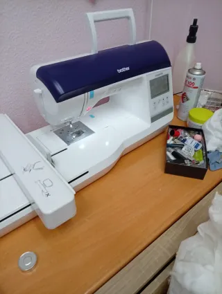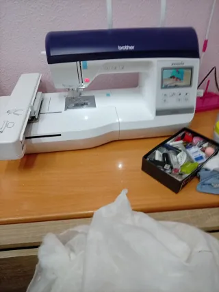 Máquina de bordar Brother Innovis en color blanco y azul. - Incluye brazo de bordado. - Pantalla digital. - Asa de transporte.