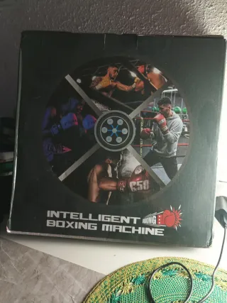 Máquina de boxeo inteligente con diseño moderno. - Pantalla circular con luces. - Ilustraciones de boxeadores en acción.