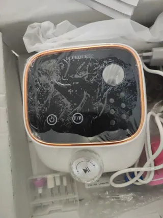 Máquina profesional para manicura y pedicura. Diseñada para un uso cómodo y eficiente. - Incluye unidad principal y pieza de mano. - Pantalla digital para control de velocidad. - Botón de control giratorio con indicador de dirección. Trae también diferentes accesorios