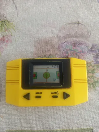 Máquina de juegos electrónica portátil de color amarillo brillante. Ideal para entretenimiento. - Diseño compacto y ligero. - Botones de control para START y GAME 1/2. - Pantalla LCD con gráficos de juego.