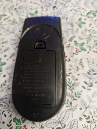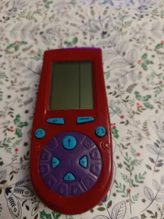 Mando a distancia de color rojo y morado. - Pantalla con dos secciones. - Botones de navegación y numéricos.