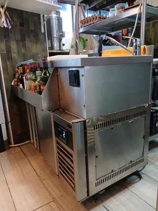 Se vende maquinaria de hostelería profesional, ideal para negocios. - Fabricado en acero inoxidable. - Diseño compacto y funcional. - Incluye nevera y zona de trabajo con fregadero.