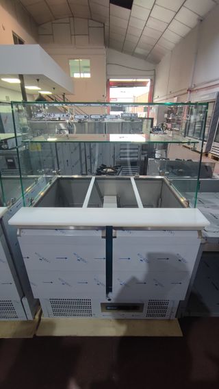 Mesa fría de preparación para toppings o ensaladas. Medidas: 180x70x130 cm de alto. Dispone de 3 puertas traseras. De dotación lleva un estante por puerta. Capacidad de hasta 3 GN1/1 ( no incluidas). Cristal frontal curvado. Termostato de alta calidad Carel e interruptor de encendido/apagado. Temperatura de trabajo 2/8 grados. Ideal para ensaladas, kebaps, heladerías , acai etc.... Enviamos a toda la península. Nueva a estrenar 1495€+IVA. Consulte sin compromiso 633961349. Exposición física de todo tipo de maquinaria para hostelería en nuevo. Calle Edison 5 Getafe. Abrimos de lunes a viernes de 10-18 h.
