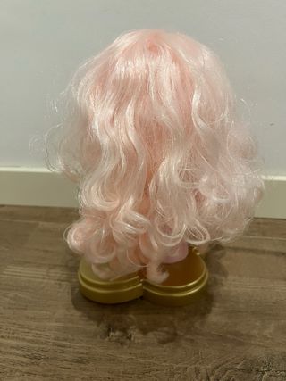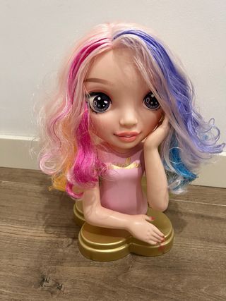 Muñeca para practicar peinados y maquillaje. Incluye una base dorada para exhibirla. - Cabello largo y multicolor. - Base con forma de corazón.