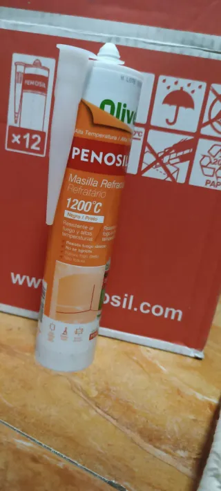 Masilla refractaria Penosil de alta temperatura. 3€ por un bote 2 por 5€ - Soporta hasta 1200°C. - Color negro. - Resistente al fuego y altas temperaturas. - No se agrieta.