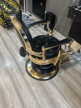 Sillón de barbería de estilo vintage con acabados dorados y tapicería negra. - Diseño clásico y elegante. - Base giratoria y reposapiés. - Tapicería de piel sintética. y dos estanterías de peluquería en buen estado todo