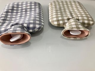 VENTA POR MUDANZA Se venden dos bolsas de agua caliente con fundas a cuadros. - Funda de cuadros gris y blanca. - Funda de cuadros beige y blanca. - Tapón de seguridad.