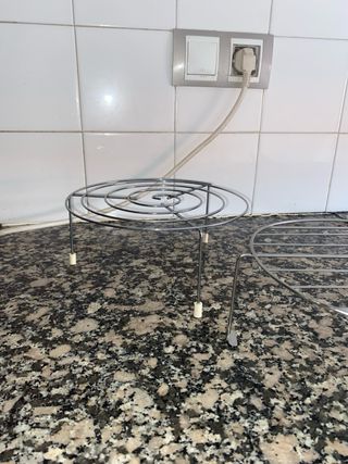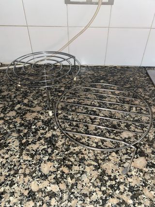 Set de dos rejillas metálicas de acero inoxidable microondas, perfectas para usar como salvamanteles o para enfriar alimentos. - Material: Acero inoxidable. - Diseño circular con patas. - Una rejilla con diseño en espiral. COMO NUEVAS.