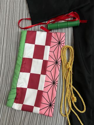 Completo disfraz de Nezuko Kamado, personaje de Demon Slayer. - Kimono rosa con estampado geométrico. - Haori negro. - Accesorios incluidos ( calcetines, bambú, peluca)