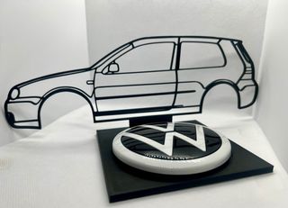 Adorno decorativo con silueta de coche Volkswagen Golf y emblema. - Diseño 3D. - Emblema VW incluido. - Disponemos de varios modelos de coches
