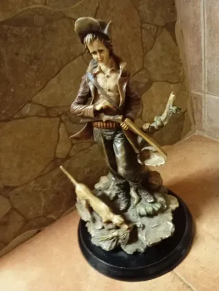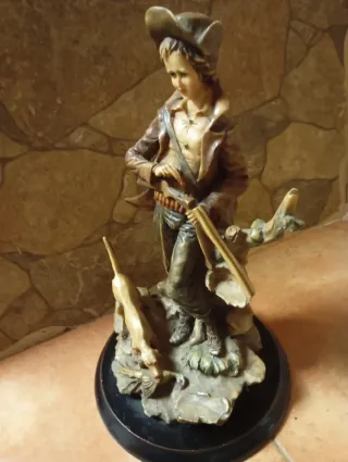 Figura decorativa de un joven cazador con su perro y escopeta. Representa una escena de caza. - Detallada figura de resina. - Base de madera oscura.