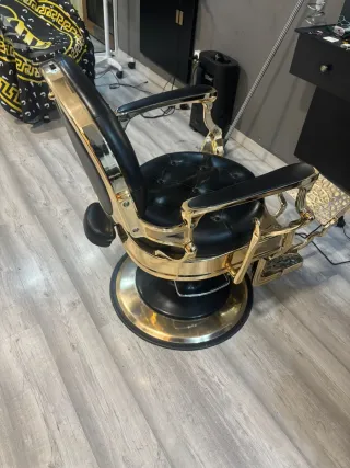 Silla de barbero de estilo clásico, con un diseño elegante en negro y detalles dorados. - Tapicería de cuero sintético. - Estructura metálica dorada. - Reposapiés integrado.