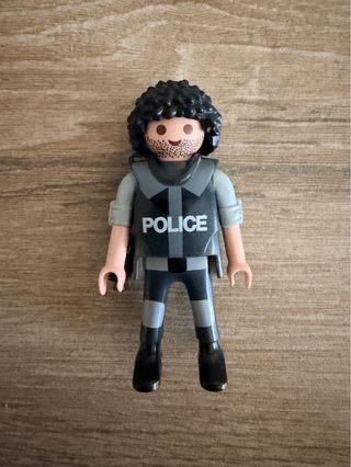 Figura de Playmobil con uniforme de policía y chaleco táctico. - Figura con pelo rizado negro. - Chaleco táctico gris con POLICE en blanco. - Pantalones grises con detalles. - Botas negras.