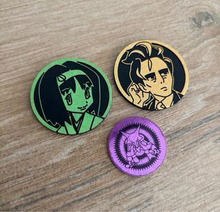 Conjunto de tres monedas coleccionables de Pokémon. - Una moneda verde con un personaje de anime. - Una moneda dorada con un personaje de anime. - Una moneda morada Alakazam (antigua)