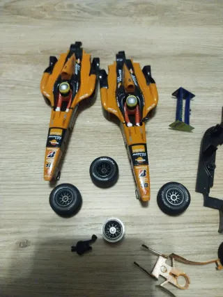 Piezas de despiece para coches F1 de Scalextric. Ideal para reparaciones o personalización. - Carrocerías de F1 naranjas con dorsal 18. - Ruedas y neumáticos. - Chasis y alerones. - Componentes varios. Scalextric,slot