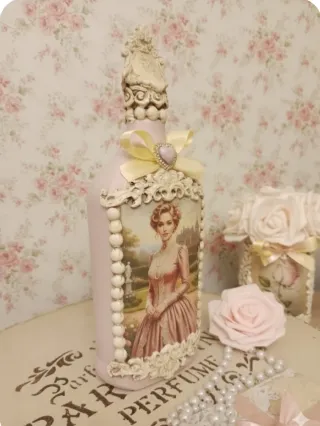 Botella decorativa con un encantador diseño de estilo victoriano. Ideal para añadir un toque de elegancia a cualquier espacio. - Diseño con imagen de dama antigua. - Adornos en relieve y perlas. - Lazo y corazón decorativo.