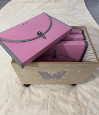 🌸 Pack Organización "Magic Angel" 🌸 ¡Hola! Vendo este set de organización súper práctico y bonito, perfecto para poner orden con mucho estilo. 🎀✨ ¿Qué incluye? • 📦 Cajón de madera con ruedas: Muy resistente, con un diseño precioso de mariposa y la frase "Make some magic in your life". ¡Súper fácil de mover! • 📂 4 Carpetas clasificadoras rosas: Son de estilo acordeón, ideales para organizar apuntes, facturas o documentos importantes. Están como nuevas. Es el combo perfecto para un escritorio de 10 o para el cuarto de los peques. 📝💕
