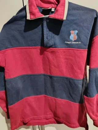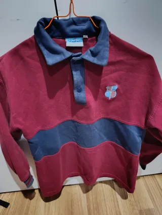 Sudadera de estilo rugby con cuello y detalles en contraste.2 sudaderas de 10 años y 2 sudaderas de 12 años y un chaleco de 3 años - Color principal burdeos. - Banda horizontal azul en el torso. - Cuello y puños en azul. - Escudo bordado en el pecho.