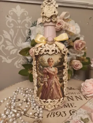 Botella decorada a mano con un estilo vintage y romántico. Ideal como pieza decorativa. - Diseño con imagen de dama antigua. - Adornos de encaje y lazo. - Remate superior ornamentado.