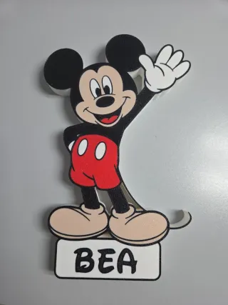 Figura personalizada de Mickey Mouse con el nombre 'que quieras'. - Diseño icónico de Mickey Mouse. - Base blanca con el nombre en letras negras.