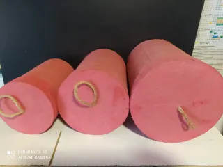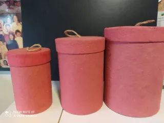 Conjunto de tres botes cilíndricos de color rojo, ideales para decoración u organización. - Material de acabado texturizado. - Tapa a juego con asa de cuerda. - Diferentes tamaños para adaptarse a tus necesidades.