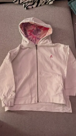 Sudadera con capucha y cierre de cremallera. Talla 7-8 - Interior de la capucha con estampado tie-dye. - Logo de la marca bordado en color rosa en el pecho. - Puños y bajo de canalé.