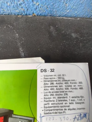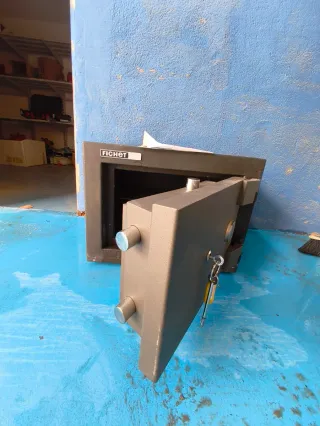 Caja fuerte profesional Fichet DS-32. - Volumen interior útil: 32 litros. - Peso aproximado: 163 kg. - Dimensiones interiores útiles (mm): Alto 290, Ancho 420, Fondo 253. - Dimensiones exteriores totales (mm): Alto 400, Ancho 530, Fondo 468. - Luz de acceso total (mm): Alto 250, Ancho 376. - Equipo interior estándar: 1 estante fijo. Incluye documentación original de compra.