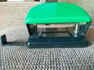 Taladradora de papel de color verde brillante. Ideal para organizar documentos. - Diseño ergonómico. - Mecanismo de resorte. - Base de plástico negro.